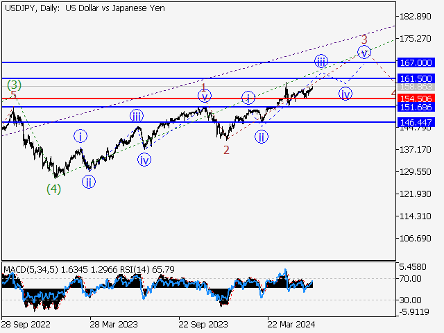 Вероятность роста пары USDJPY сохраняется. Предполагаемая точка разворота находится на уровне 154.50.